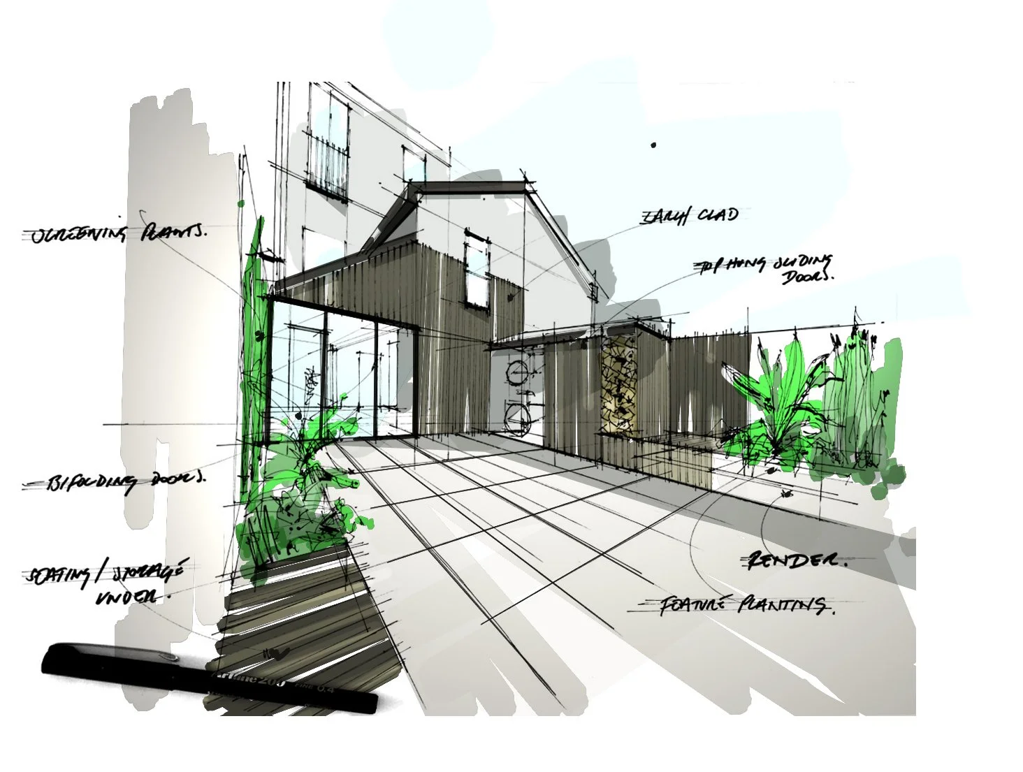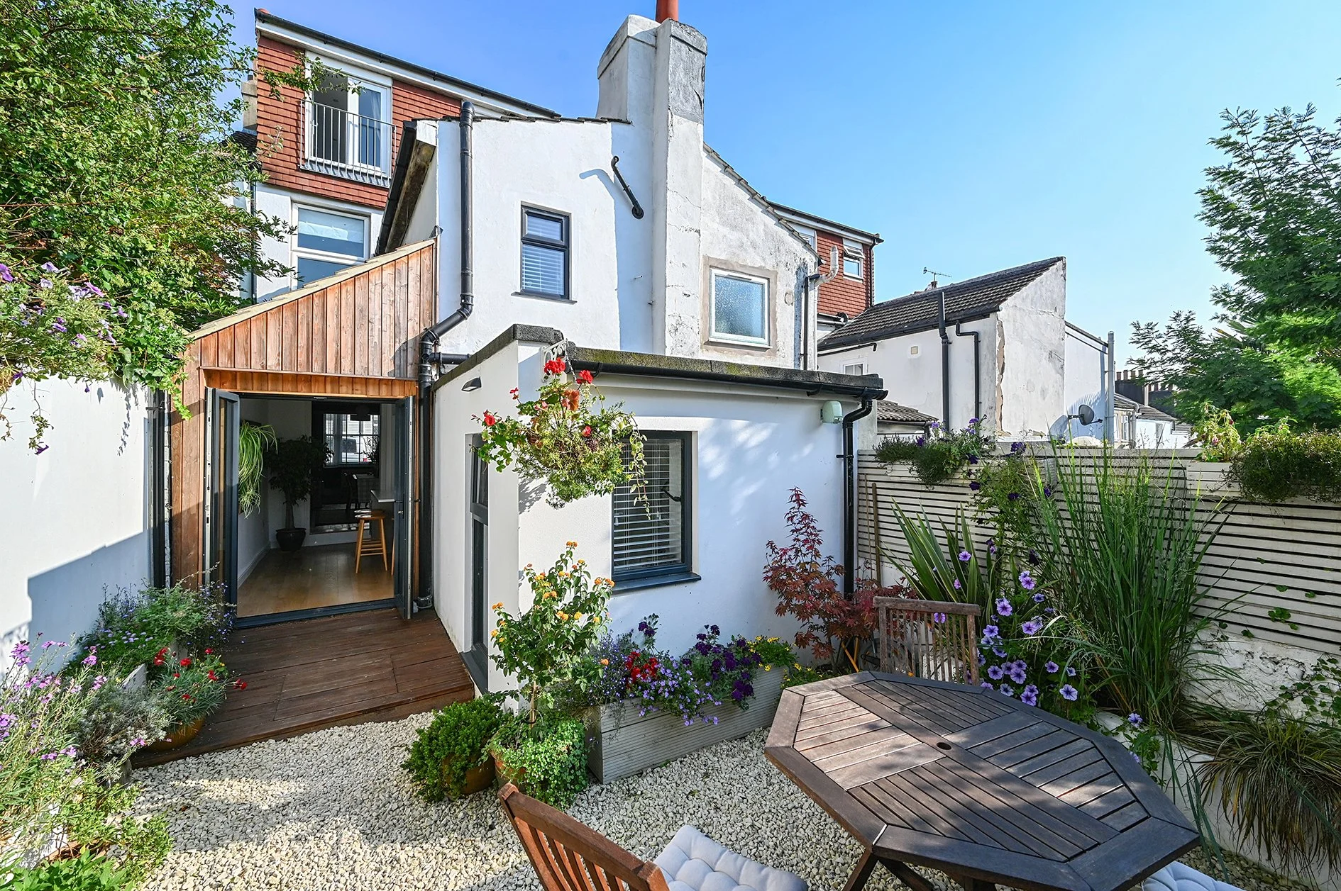 The layout was refined to retain the utility area, allowing the creation of a functional home office — an increasingly valuable feature for modern living. Externally, a compact patio garden was professionally landscaped, featuring timber decking that seamlessly links to the larch-clad rear façade, delivering warmth, texture, and architectural cohesion.