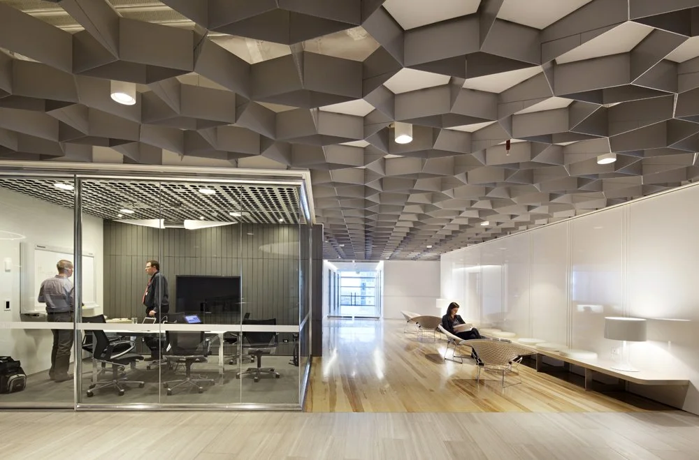 Each floor features a combination of breakout spaces, private consultation areas, and bump zones, supporting flexible working and team interaction. Natural materials paired with aluminium cladding provide a modern, durable aesthetic, while ceiling treatments exposing the underside of slabs and ductwork add depth, texture, and a unique industrial character. Thoughtful layout planning ensures clear sightlines and intuitive orientation, guiding occupants effortlessly throughout the building.